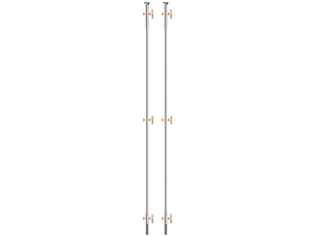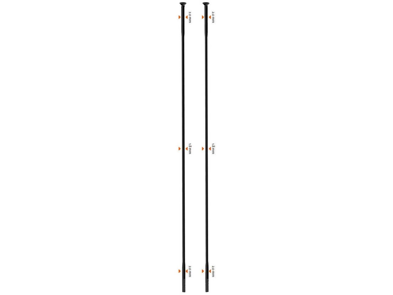 Technical Information:Type:double-butted spokeMaterial:stainless steelSize:14 gauge (2.0 mm)Diameter:2.0-1.8-2.0 mmLength:234 mm – 304 mm (in 2 mm increments)Mid Section Strength:1300N/mm²Head:straight pull (straight)Features:low elasticitygood shock absorptionstrength in the middle section increased by at least 48 % compared to non-butted spokesSapim Cold Forging Technology (SCFT System)manufacturing according to ISO 9001incl. 12 mm brass nippleColour Index:black:black spokes, black nipplessilver:silver spokes, silver nipplesContents:100 x Sapim Race straight pull spokes100 x Sapim 12 mm brass nipples